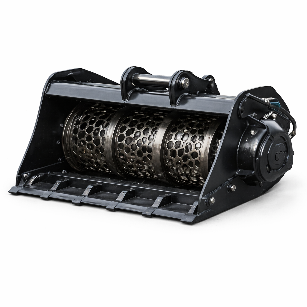 Transformez votre engin en solution de tri mobile grâce au godet cribleur : il sépare efficacement la terre, les cailloux et les matériaux inertes.