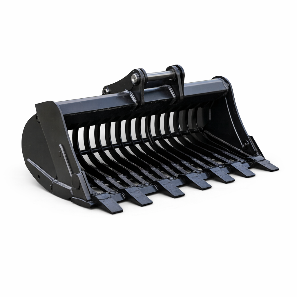 Un accessoire très efficace pour le tri de matériaux et la préparation de chantier avec un godet squelette performant.